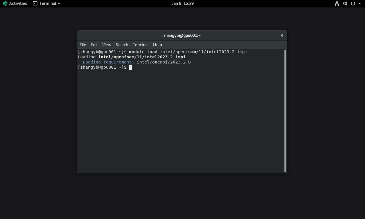 首先在Linux桌面打开SSH终端,执行命令加载OpenFOAM V11软件: