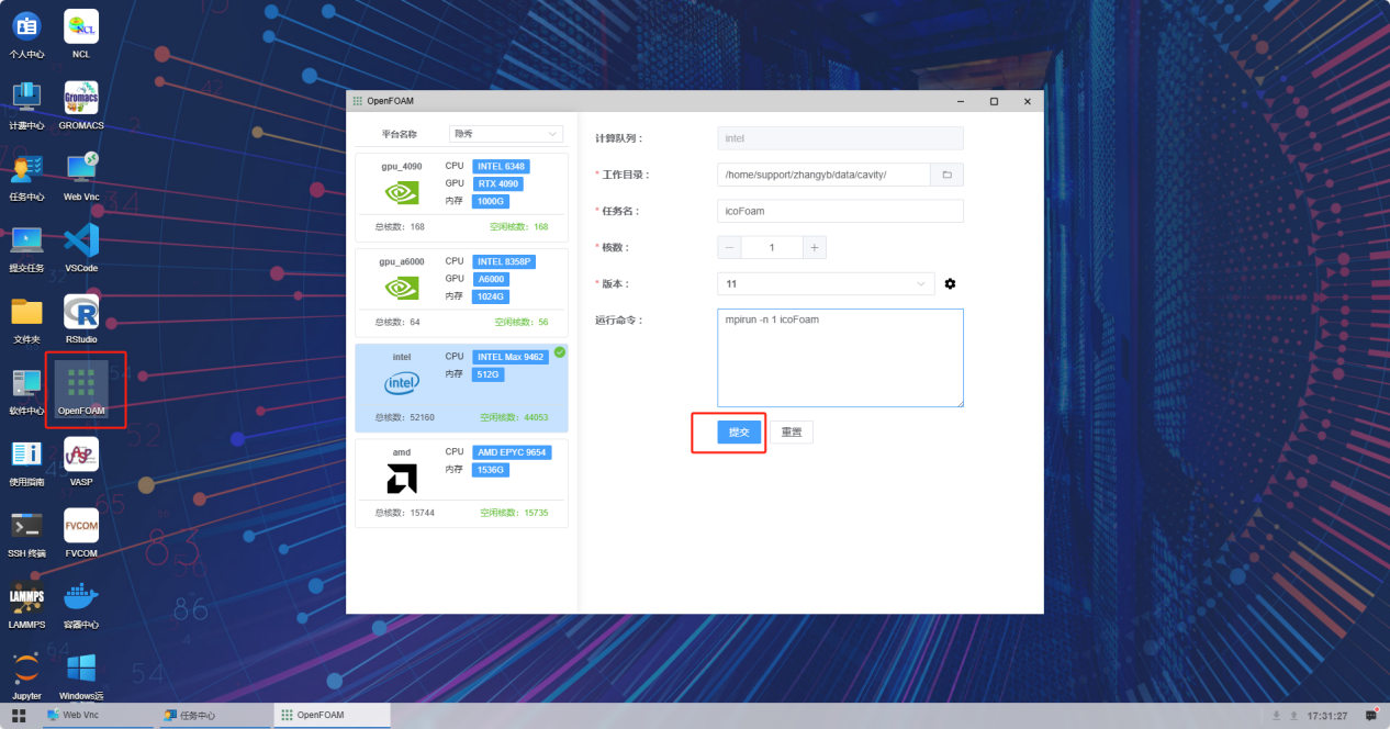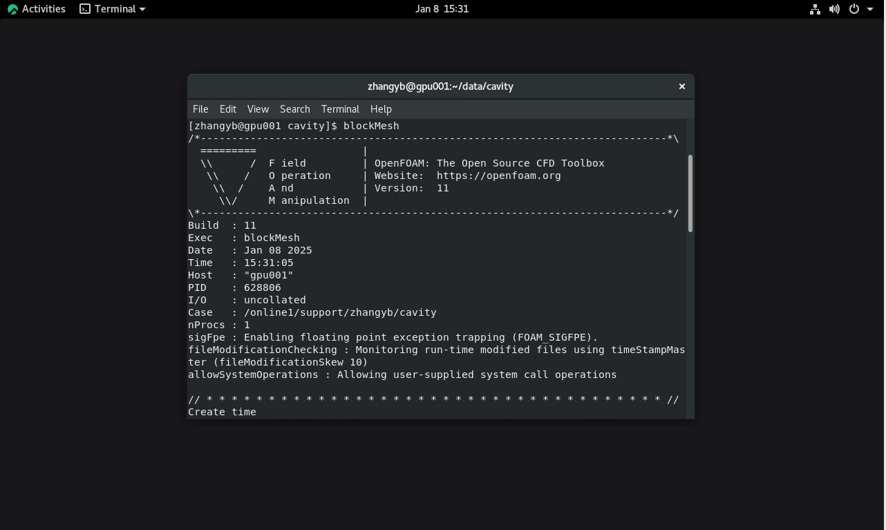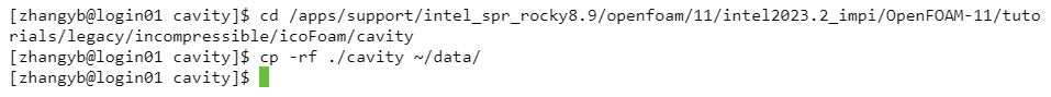 OpenFOAM安装在目录:/apps/support/intel_spr_rocky8.9/openfoam/11/intel2023.2_impi/OpenFOAM-11,cavity算例位置在:/apps/support/intel_spr_rocky8.9/openfoam/11/intel2023.2_impi/OpenFOAM-11/tutorials/legacy/incompressible/icoFoam/cavity,然后使用云桌面SSH终端把cavity案例复制到家目录data存储下。
