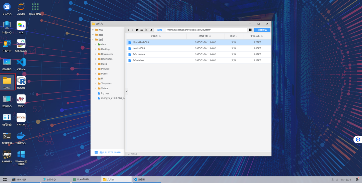 之后使用云桌面文件夹工具,双击打开cavity下的system中的blockMeshDict文件: