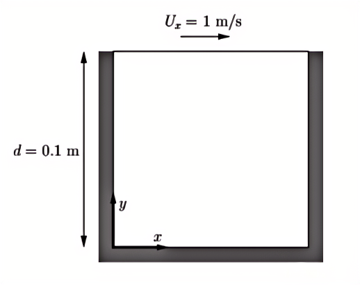 如上图所示,cavity算例涉及二维正方形区域内的等温不可压缩流动,上图中几何体的所有边界都是由墙体组成。在x方向墙体以1m/s的速度移动,而其他3个墙体是静止的。流动假设为层流,将在均匀划分的网格上使用icoFoam求解器求解层流等温不可压缩流动。
