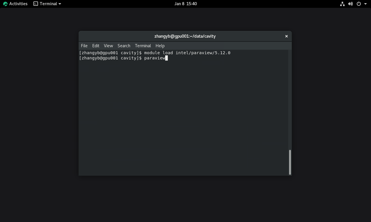 首先在Linux桌面打开SSH终端,执行命令加载paraview软件: