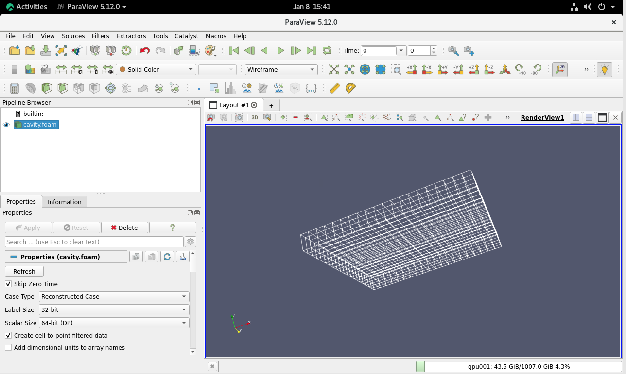 然后运行paraview命令加载blockMesh生成的.foam文件,并查看划分完成的网格: