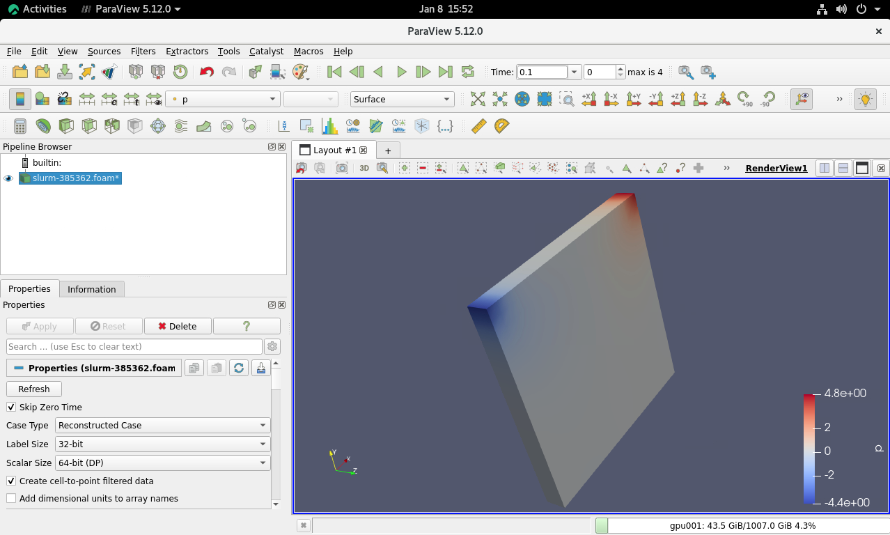 首先将icoFoam生成的.out文件后缀修改为.foam,同上面前处理,打开Linux桌面运行paraview命令加载.foam文件对计算结果进行后处理: