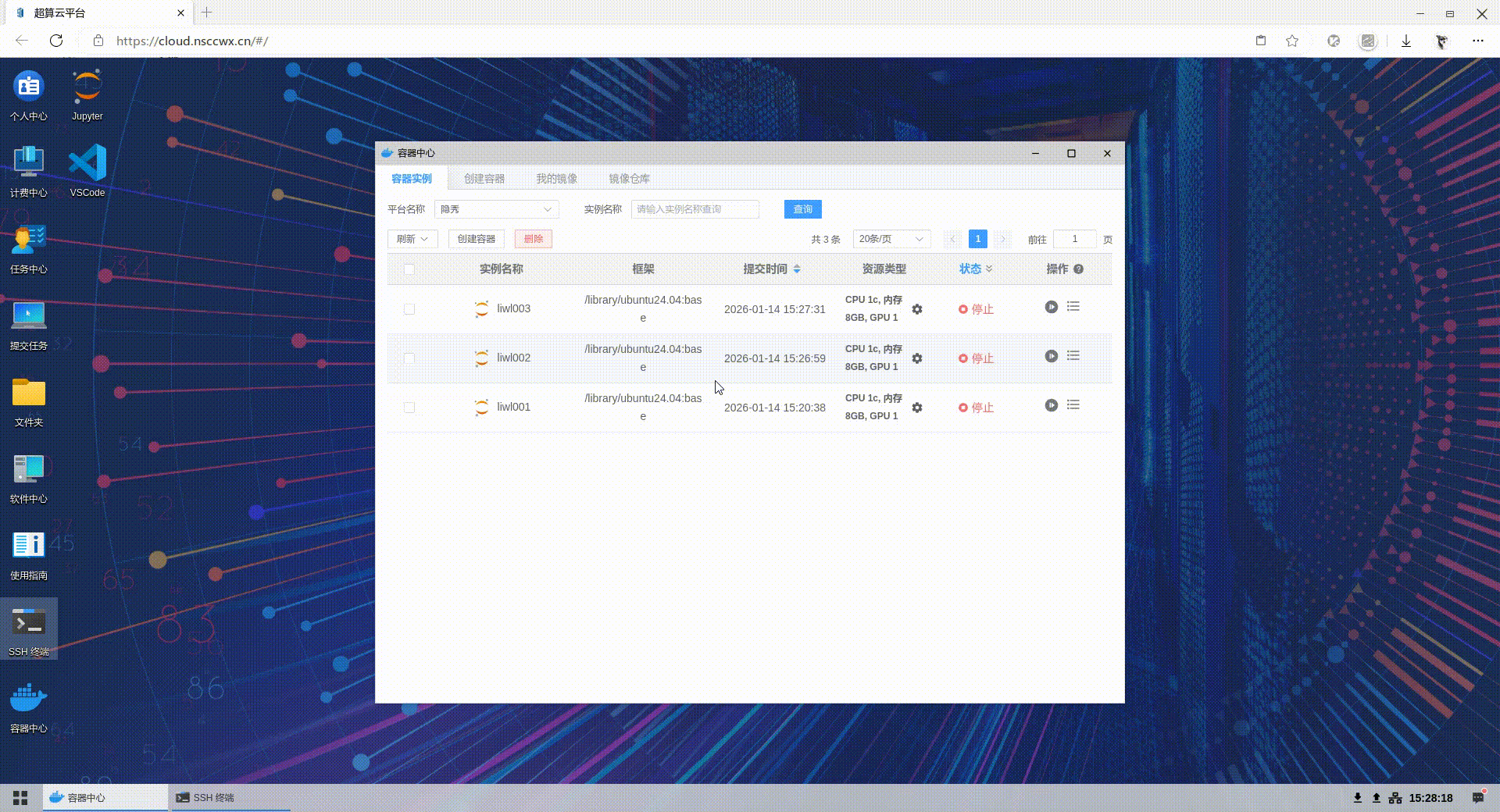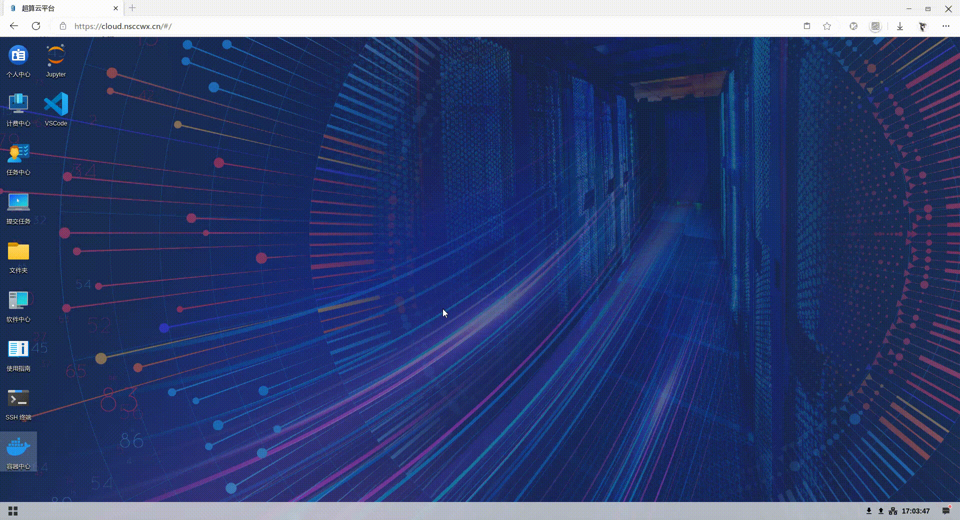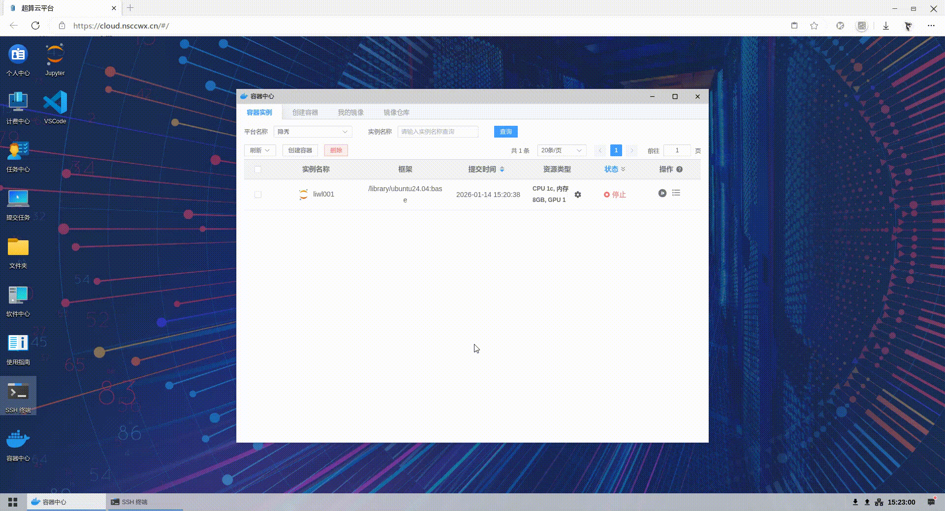 无锡超算云桌面集成了【容器中心】功能。通过桌面的快捷方式打开容器中心,能够进行容器任务提交和管理,镜像管理等功能。